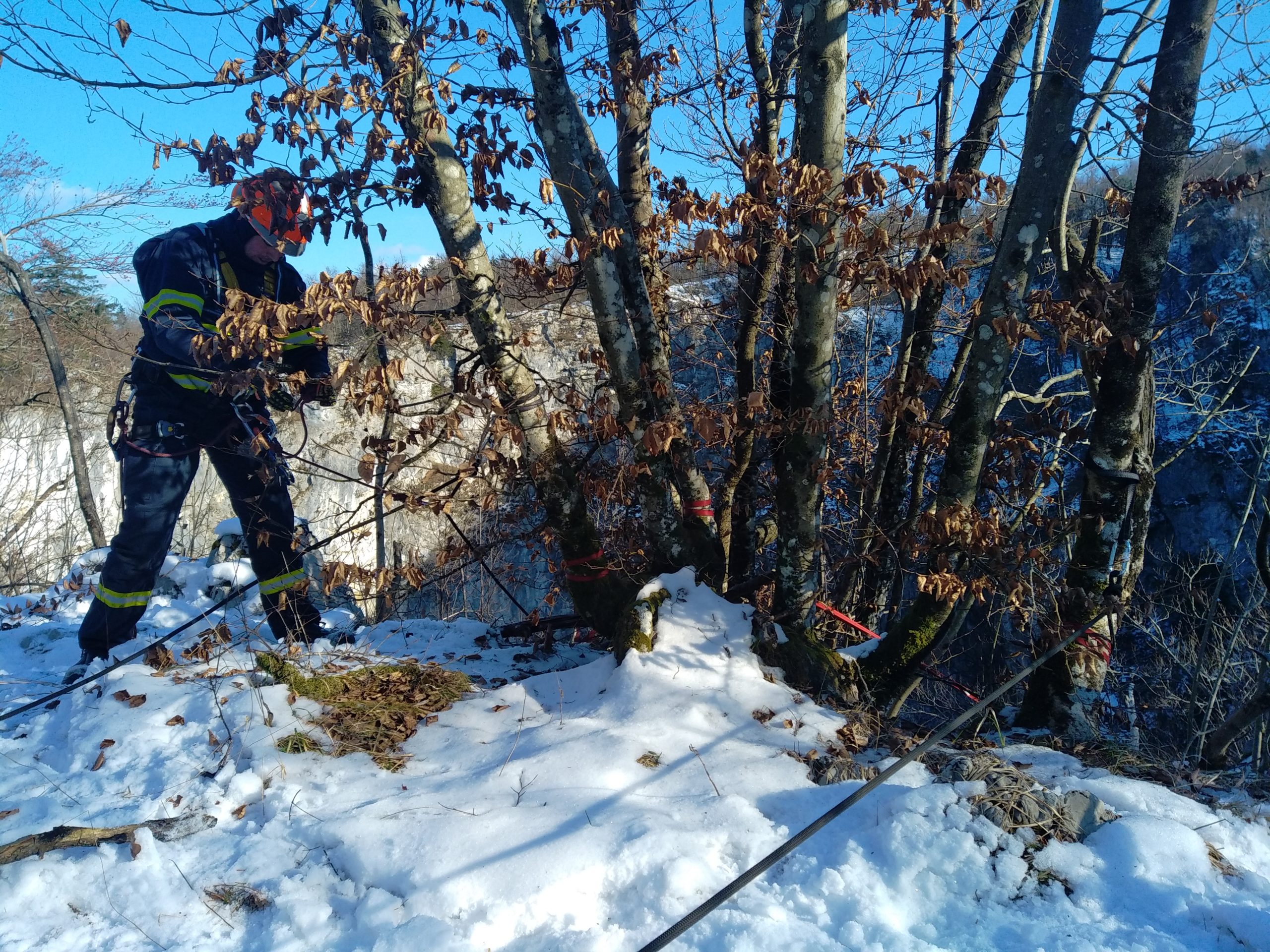Prve vaje skupine za vrvne tehnike v letu 2021 so bile na temo aktivnega spusta in dviga. Vaje so se izvajale na terenu, kjer je bilo zagotavljanje trenutno aktualnih ukrepov lažje. Na vajah smo preizkusili nove dvodelne delovne pasove z integrirano prsno prižemo. Po opremljanju v osebne komplete smo ponovili izdelavo sidrišč, vadili gibanje ob vrvni ograji, izvedli priprave na spust z varnostnim pregledom in se spuščali s stop zavoro. Med spuščanjem po vrvi se je vadilo zaustavljanje na višini z varovanjem ter na koncu še dvig s pomočjo prižem. Foto.
