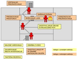 Osnovne naloge gasilcev v notranjem sektorju reševanje ljudi, preiskovanje, gašenje požara ter prezračevanje. Pred pričetkom kakršnih koli aktivnosti je potrebno poskrbeti za varnost gasilcev ter zapreti plinsko požarno pipo in izklopiti električno energijo v ogroženih prostorih. Naloge napadalnih skupin v objektu so torej naslednje: