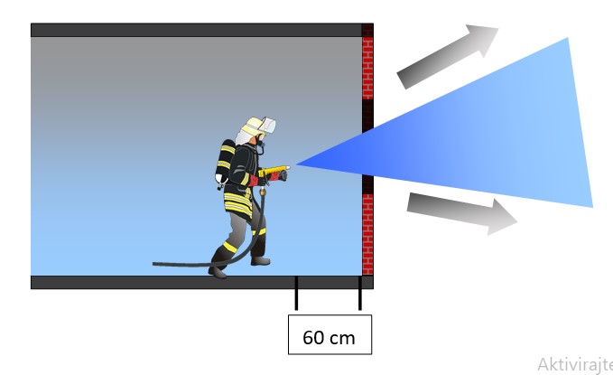 Vodja skupine (N1) po preverjanju vrat vidno nakaže spremembo temperature na vratih gasilcu, kateri dobi informacijo, kam – v katero višino naj usmeri curek. Ko vodja skupine odpre vrata, gasilec preveri pravilnost podatka s pogledom ter v prostor pošlje ustrezno oblikovan in časovno dolg curek (2 do 3 sekunde). Da bomo gasilno sredstvo – vodo izkoristili v popolni meri je potrebno po vstopnem curku, za nekaj trenutkov vrata tudi zapreti (5 sekund). V kolikor ocenimo, da je situacija v notranjosti resna lahko omenjen postopek odpiranja, ohlajevanja in zapiranja vrat ponovimo, tudi večkrat. Ko ocenimo, da je prostor dovolj ohlajen, odpremo vrata ter se poizkušamo čim prej umakniti stran od sredine vrat. Pri tem se vodja skupine postavi za gasilca, kateri med napredovanje po potrebi še vedno ohlajuje pline nad seboj. Gremo levo ali desno od vrat ter ne čakamo med njimi, da nas ne onemogoči skozi vrata izhajajoča vodna para, katera je nastala iz v prostor poslane vode.
