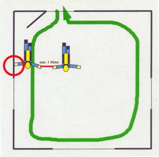 - tehnika obkrožanja: je najosnovnejša ter najlažja tehnika, ki jo uporabljamo predvsem pri preiskovanju manjših prostorov do velikosti 5 x 5m. Sama tehnika se izvaja praviloma tako, da napadalca zunaj prostora naredita pritrdišče za svojo preiskovalno vrv in nato vstopita v prostor, kjer se gibata v dogovorjeni smeri. Napadalca se gibljeta ob steni. Med samim preiskovanjem lahko napredujeta vzporedno tako, da je prvi napadalec ob steni, drugi napadalec pa na njegovem boku. Kot podaljšek lahko uporabljata ročaj sekire.