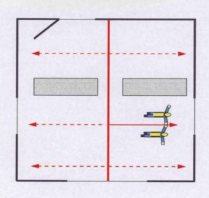 Izvajamo, ko imamo na začetku posredovanja na razpolago eno samo napadalno skupino, pri tem pa predvidevamo, da je lahko v objektu oseba. Skupina ima s seboj gasilno sredstvo – vodo. Ta ji služi samo za varnost. Gasimo v primeru potrebe, ko se približujemo ogroženim osebam.