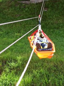 Na tokratnih nedeljskih vajah smo vadili reševanje ponesrečenih oseb iz objekta, kjer ni mogoč drug iznos kot z uporabo vrvnih tehnik. Za ta namen smo izdelali “tirolko” po kateri smo s koritastimi nosili transportirali ponesrečence. Pri tem smo se seznanili tudi z izdelavo zanesljivih sidrišč v objektih in različnimi načini navezave nosil na sistem.