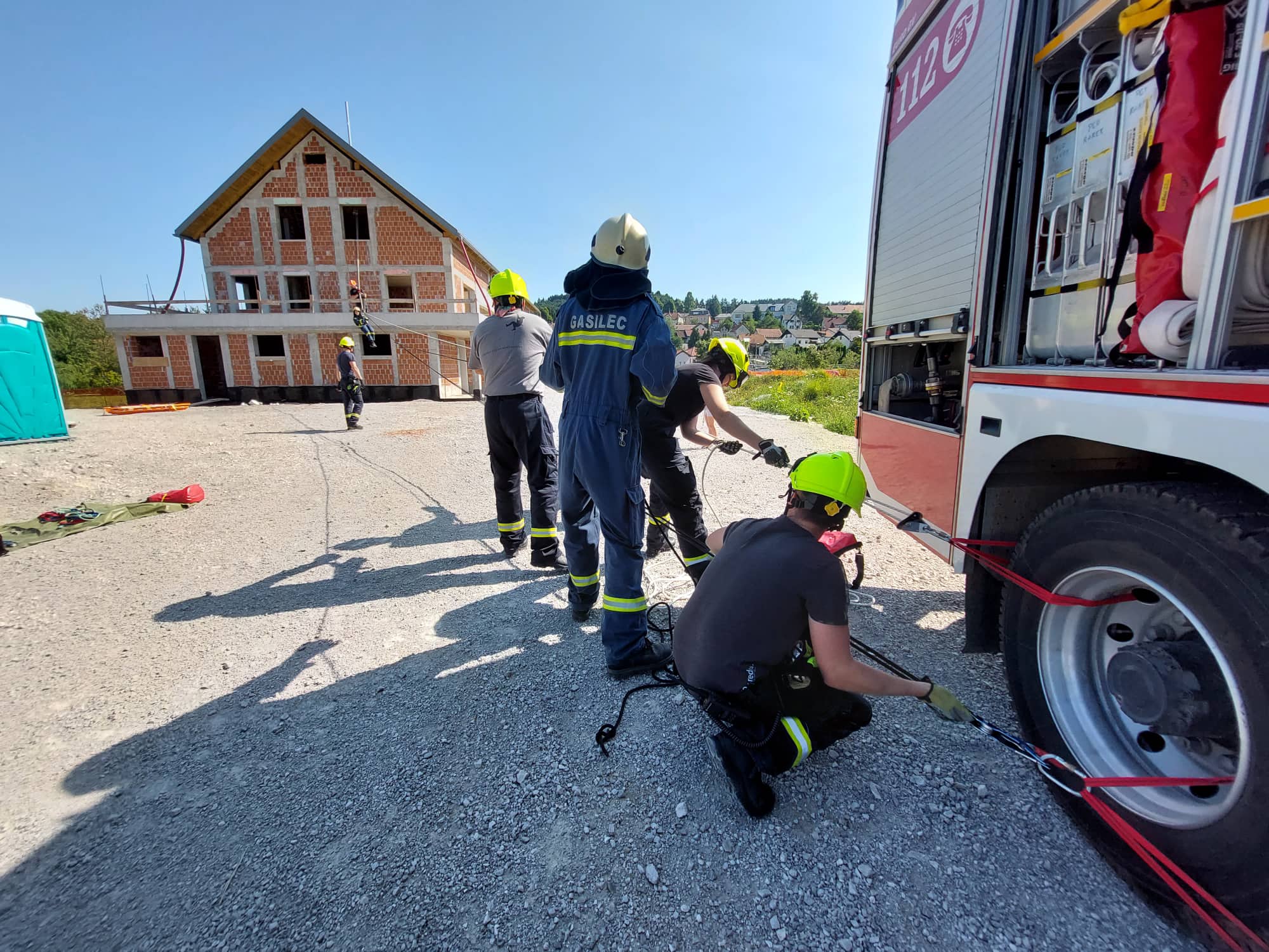 Julijske nedeljske vaje operative so bile namenjene delu z vrvnimi tehnikami. Tokrat smo povadili reševanje iz višjih nadstropij s pomočjo preprostega sistema, žičnice, namenjene za spust ujetih ali poškodovanih oseb. Po kratkem teoretičnem delu smo začeli sistem sestavljati po korakih, tako da smo imeli vsi sodelujoči možnost opazovati in izvajati vse postopke. Korak po korak smo sestavili sidrišče izven objekta, sidrišče v objektu, predebatirali alternativne načine izdelave sidrišč v objektih, napeljali vrvi, pripravili nosila ter predebatirali možne težave ob reševanju (poves, ovire) ter kako jih rešiti oziroma se jim v čim boljši meri izogniti. Ko je bil sistem vzpostavljen smo večkrat preizkusili transport s pomočjo koritastih nosil in reševalnega trikotnika.