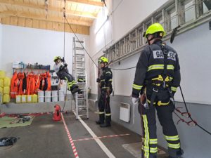 Nedeljske vaje so namenjene obnavljanju in pridobivanju novega znanja predvsem iz področja vrvnih tehnik in prve pomoči. Tako smo na tokratnih vajah obnovili znanje iz napeljave vrvne ograje, katera se nadaljuje v sidrišče za izvajanje aktivnega spusta. Vsak gasilec je izdelal vrvno ograjo in sidrišče za spust, vsi ostali pa so nato po njegovi vzpostavitvi sistema izvedli gibanje ob vrvni ograji, pripravo na spust in spust, zaustavitev na višini ter nadaljevanje spusta. Pri prvi pomoči se je pregledalo obe torbi za PP iz GVC, popisalo material, katerega bo potrebno osvežiti ter vadilo oživljanje otroka in odrasle osebe s pomočjo AED in TPO. Foto