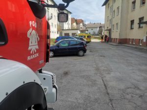 Ob 13.21 so na Partizanski cesti na Rakeku, občina Cerknica, gasilci PGD Rakek pomagali ekipi NMP Cerknica pri prenosu obolele osebe iz tretjega nadstropja stanovanjskega objekta do reševalnega vozila.
