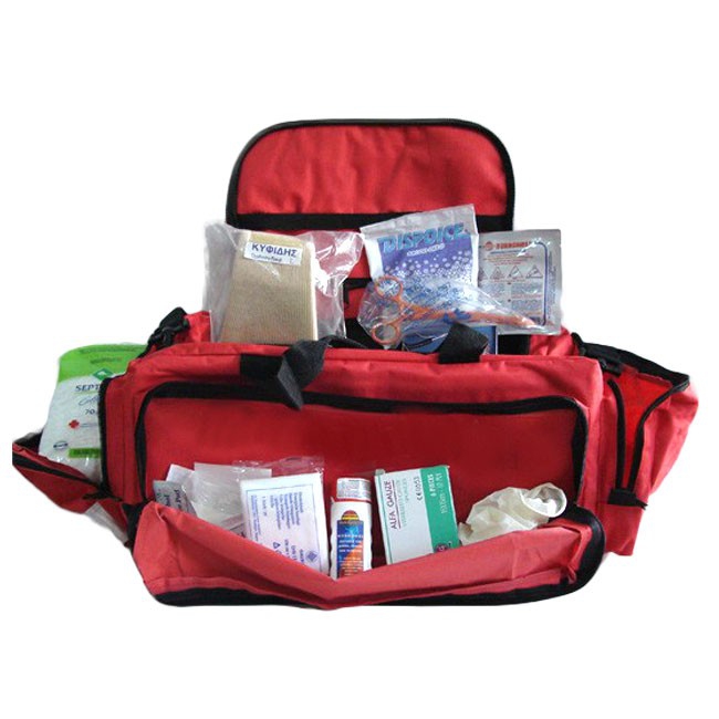 Obvezen pripomoček so prilagojene škarje – tope na eni strani, ki jih potrebujemo za več stvari (rezanje obleke itd.). Priporočljivo je imeti tudi plastensko fiziološke raztopine za izpiranje (tujek v očesu, tujek v rani itd.). Ker moramo vedno zabeležiti podatke, se mora v torbi nahajati tudi papir in svičnik za pisanje.