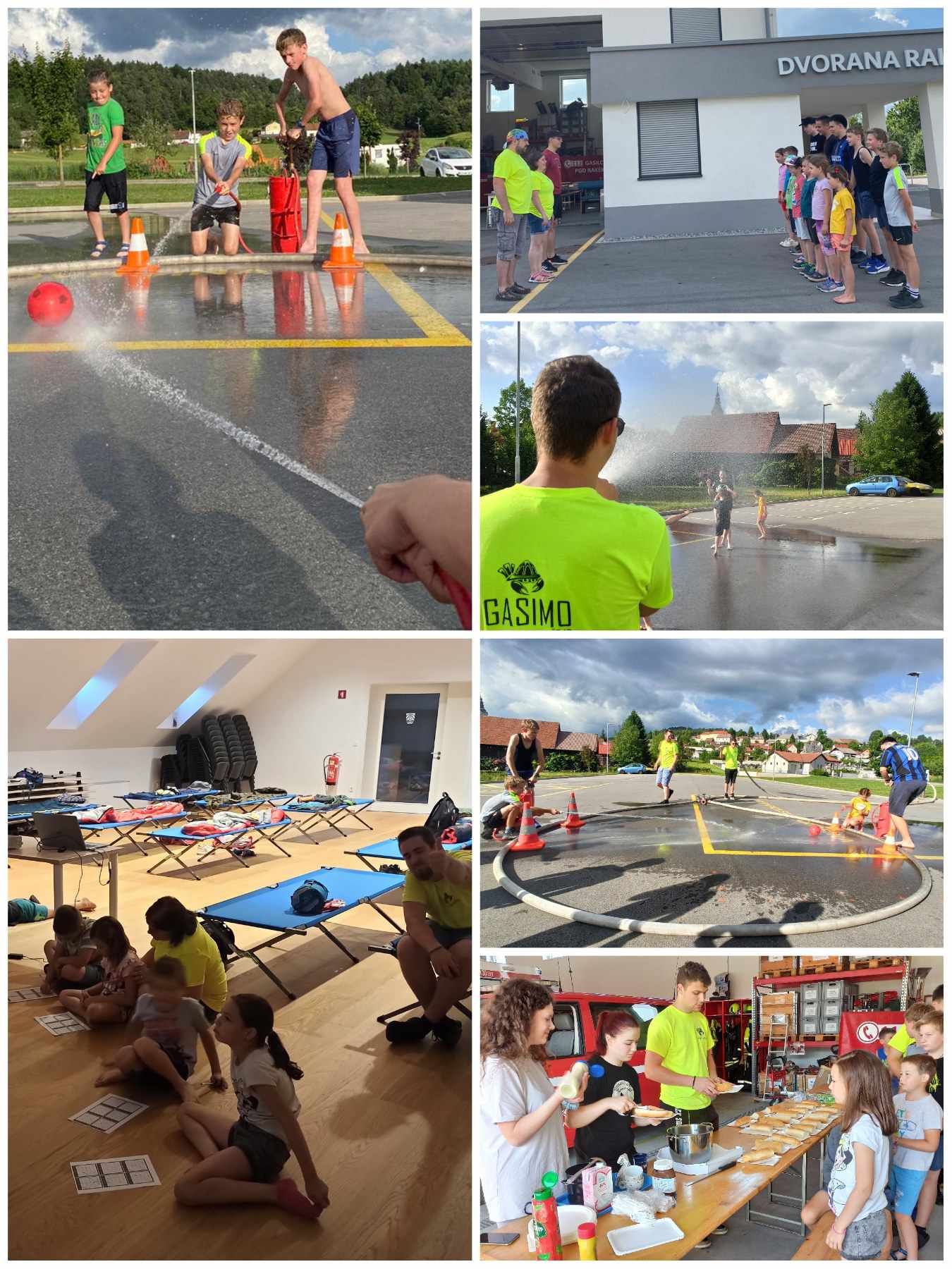 Vrvež se je začel ob 17:00 s prihajanjem in urejanjem spalnega prostora. Sledil je postroj in pojasnitev dogajanja. In začele so se že vodne igre! Poimenovali smo jih kar “Gasilski nogomet”, saj so morali otroci s curkom iz brentače zadeti gol. Tekme so bile izjemno napete in navijači zelo glasni. 🙂 Počutili smo se kot na evropskem prvenstvu v nogometu. 😉 Sledila je zaslužena večerja. Ker je bilo že temno zunaj, smo se preselili v dvorano, kjer smo mentorji pripravili Bingo. Poskrbeli smo tudi, da je vsak otrok dobil nagrado. Otroci so bili že utrujeni in so se po preoblačenju in umivanju zadekali v spalne vreče. Med gledanjem filma je že marsikateri zaprl učke in zaspal.