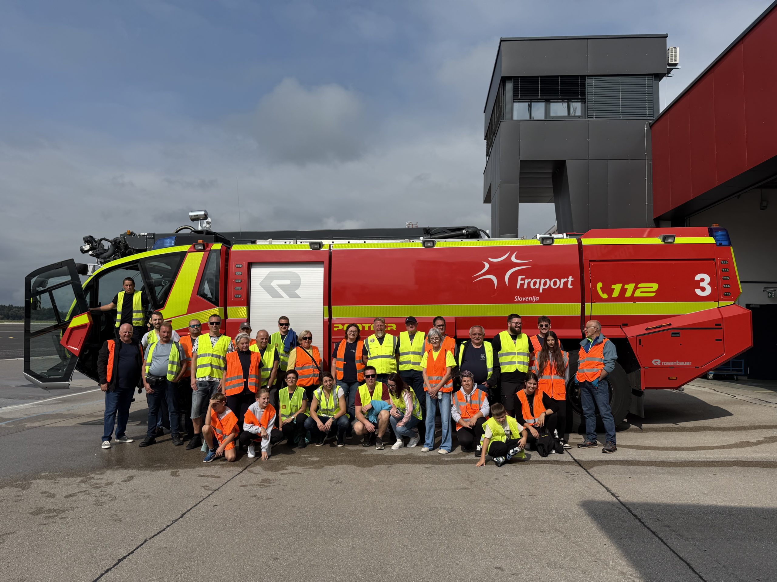 Zjutraj smo se odpravili na letališče Jožeta Pučnika, kjer nas je sprejela poklicna gasilska enota Fraport. Razkazali so nam vozni park in predstavili njihovo delo.