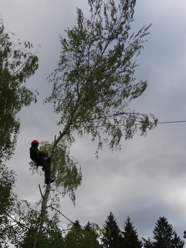 Izkoristili priložnost in ob nudenju storitve poseka dreves, katera so bila tik ob objektih in jih po normalni poti ni bilo mogoče odstraniti, preverili ustreznost OPR za delo sekačev – plezalcev. Zakaj? Zato ker se gasilci večkrat srečujemo z odstranjevanjem posledic neurja, med katera sodijo tudi podrta in obvisela drevesa. Namen tega operativnega postopka je zagotavljanje zadostne varnosti gasilcev, kateri plezajo in klestijo oziroma podirajo drevo po delih. Delo zajema znanje varnega dela na višini, poznavanje vrvne tehnike in dela z motorno žago. Na vaji so sodelovali trije gasilci – sekači in trije gasilci, ki so skrbeli za dela na tleh. Pri delu smo uporabljali zaščitne gasilske kombinezone, protivrezne hlače, čelade z možnostjo zaščite oči in sluha, gasilske čevlje, rokavice in komplet vrvne tehnike (škripčevje, vrvi, varovalni pasovi,…). Drevesa se je s pomočjo lažjih motornih žag klestilo in podiralo od zgoraj navzdol, izpostavljene dele pa se je spravilo na tla s pomočjo škripčevja.
