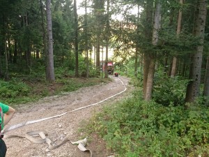 Namen tokratne vaje je bil preizkus operativnega postopka za napeljavo cevovodov v visoke stavbe. Zaradi vročine se je lokacijo vaje prestavilo iz požarnih stopnic osnovne šole v senco gozda nad nogometnim igriščem. Bolj temeljito smo preizkusili samo postopek postavljanja B cevi, postavitev C cevi in celoten postopek na pravem stopnišču pa sledi naslednjič.