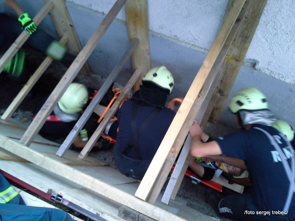 Današnje vaje bolničarjev so bile na temo delovnih nesreč. Poudarek vaje je bil na varnosti poškodovanega in sodelujočih reševalcev, pravilnemu postopku zavarovanja jarka in pravilni oskrbi ponesrečenca. Po scenariju vaje je med opravljanjem zemeljskih del za objektom prišlo do delnega zasutja delavca. Zaradi varnosti sodelujočih smo jarek simulirali s podpornim zidom brežine in steno gasilskega doma. Za izvedbo zavarovanja jarka smo uporabili gradbeni les (manjših dimenzij kot bi bil uporabljen v realni situaciji) in vezane plošče. Ker je bil poudarek na vajah bolničarjev se zavarovanja ni naredilo popolnoma po pravilu (varovalke na podpornih elementih, spodnja povezovalna gred). Po zavarovanju jarka in prikazu odkopavanja ponesrečenca se je dela lotila ekipa bolničarjev. Njihova naloga je bila oskrbeti in pripraviti ponesrečenca na čim prejšnji iznos iz jarka na varno mesto, kjer bi ga v realni situaciji že pričakala ekipa NMP. Pri oskrbi in iznosu iz jarka so morali pokazati kar nekaj iznajdljivosti in znanja – ovirala sta jih omejen prostor, podporni elementi in sam položaj poškodovanca. Ker še nimamo ustreznih nosil smo improviziral z opremo in priročnimi sredstvi, katere imamo v enoti.