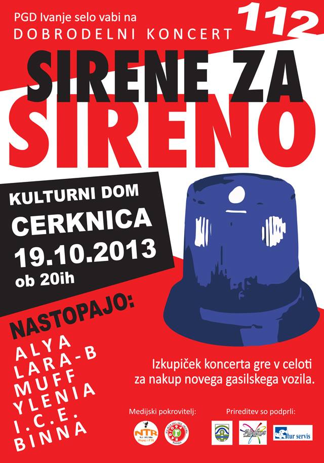 PGD Ivanje selo vabi vse gasilce in ostale občane, da jih podprejo in pridejo na koncert “Sirene za sireno”, ki bo v soboto, 19.10.2013 v Kulturnem domu v Cerknici. Vstopnice za dobrodelni koncert je mogoče kupiti samo na blagajni KD Cerknica na dan dogodka, cena oziroma donacija je 12 EUR. Zbrani denar se bo namenil za nakup novega gasilskega vozila, tipa GV-1. Nastopajo Lara B., Alya, Ylenia Zobec, Binna, I.C.E. in Muff. Nakup karte bo pomagal k temu, da bodo gasilci PGD Ivanje selo bolje opremljeni, hitrejši in odzivnejši – morda lahko celo reši kako življenje.