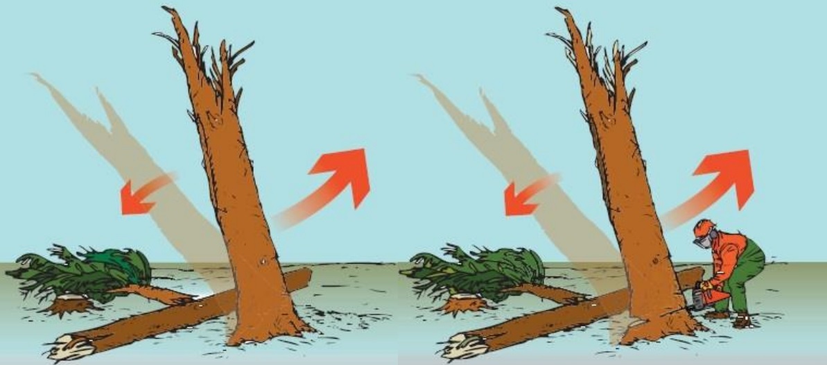 Pospravljanja podrtega drevja se sami ne lotevamo, razen če nismo usposobljeni za sanacijo v ujmah podrtega drevja. Četudi imamo traktor za vlačenje lesa in smo usposobljeni za podiranje drevja, to še ne pomeni, da smo usposobljeni za podiranje drevja, podrtega v ujmah. Drevje, ki leži po tleh brez reda, je nepredvidljivo. Zelo težko je mogoče predvideti, kaj bo posamezni rez z motorno žago povzročil. V podrtih deblih in vejah so različne napetosti, ki so nastale pri padcu in se ob žaganju nepredvidljivo sprostijo. Zato se gozdov, ki so močno prizadeti, čistijo s stroji za sečnjo in spravilo lesa, če teren to omogoča. Če stroji niso na voljo ali pa zaradi terena ne morejo opraviti svojega dela, les spravijo iz gozda za to posebej usposobljene ekipe delavcev, ki pa pri delu niso vezane na normo. Delo je tako nevarno, da vedno poteka počasi in premišljeno. Vir: http://www.gozd-les.com/