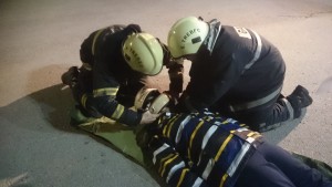 Na tokratnih vajah bolničarjev se je vadilo na dveh delovnih točkah. Na prvi delovni točki se je izvajal hitri pregled poškodovanca, snemanje motoristične čelade in log roll nalaganje na nosila, na drugi pa iznos iz osebnega vozila s pomočjo zajemalnih nosil. Na koncu vaj smo si pogledali še hiter iznos poškodovanca iz kabine tovornega vozila s pomočjo neskončne zanke.