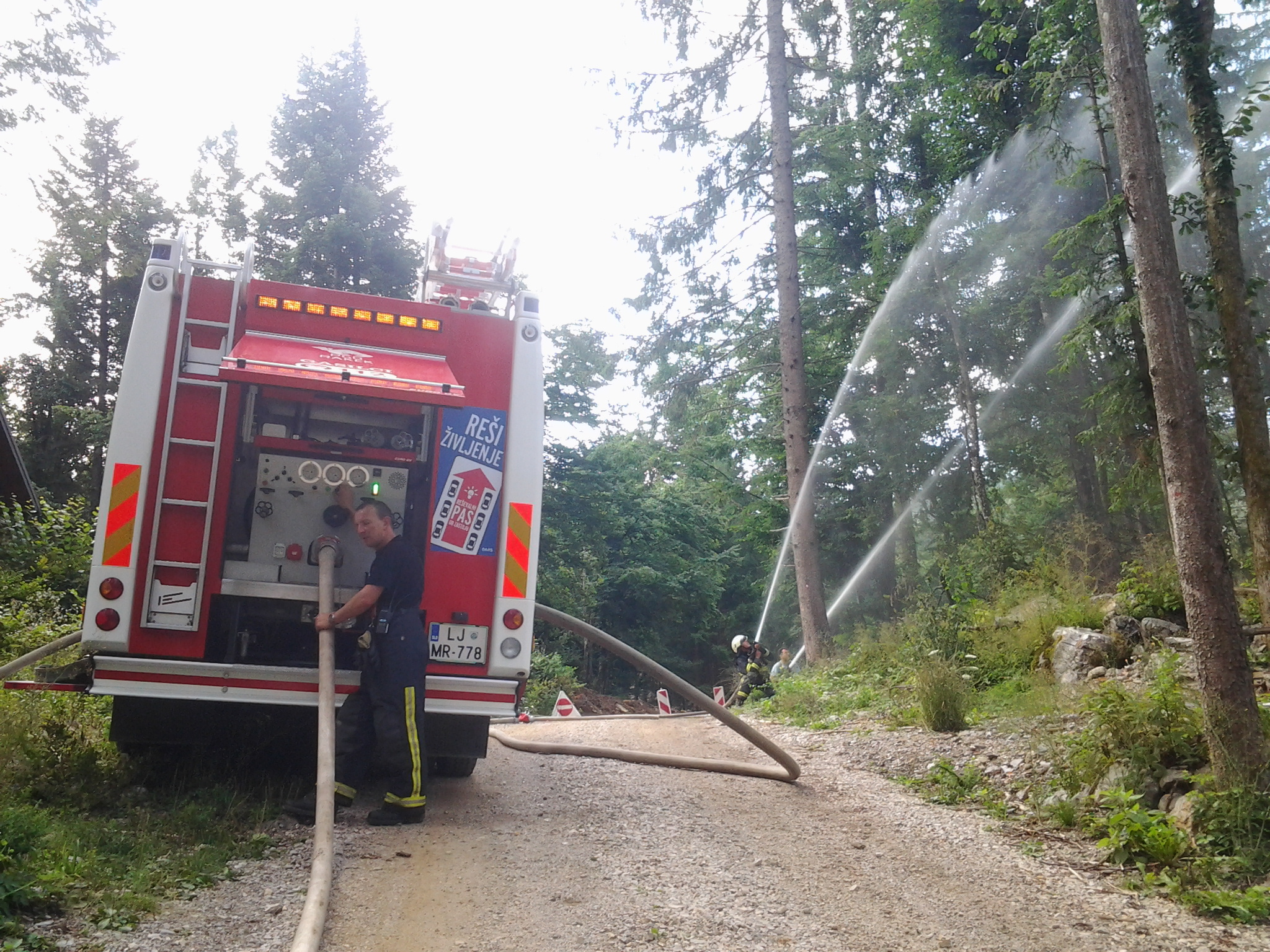 Sobotno dopoldne smo izkoristili za vaje strojnikov in voznikov GVC 16-25. Vaje so se izvajale v Rakovem Škocjanu, kjer je veliko vikendov in vsi so brez hidrantnega omrežja. Edini vir vode je približno 250 metrov oddaljena struga reke Rak. Poleg vadbe strojnikov in voznikov je bil namen vaje tudi poizkus spraviti vodo s pomočjo ene MB 8/8 do GVC 16-25 in nato s pomočjo črpalke na vozilu naprej za potrebe gašenja. Zaradi omejenosti s količino B cevi v vozilih se je vodo spravilo do začetka naselja. Da bi prišli do konca naselja bi se potrebovalo še eno MB in dodatnih 250 metrov cevi. Sama vaja je bila izvedena postopoma po posameznih korakih dobave vode. S pomočjo vrvne tehnike se je spustilo MB 8/8 na odvzemno mesto ob reki Rak, kjer se je pripravilo MB in izvedlo sesalni del. Sledila je napeljava 240 metrov dolgega B cevovoda do začetka naselja, kjer je bil GVC 16-25 in postavitev B voda do trojaka ter dveh C napadov. Ko je bil celoten sistem vzpostavljen se je začelo z dobavo vode in simulacijo gašenja. Še nekaj podatkov: od MB 8/8 do GVC 16-25 je voda potrebovala 1 minuto, vmes se je zaradi višinske razlike, armatur in razdalje izgubilo približno 3 bare tlaka. Fotografije iz vaje.