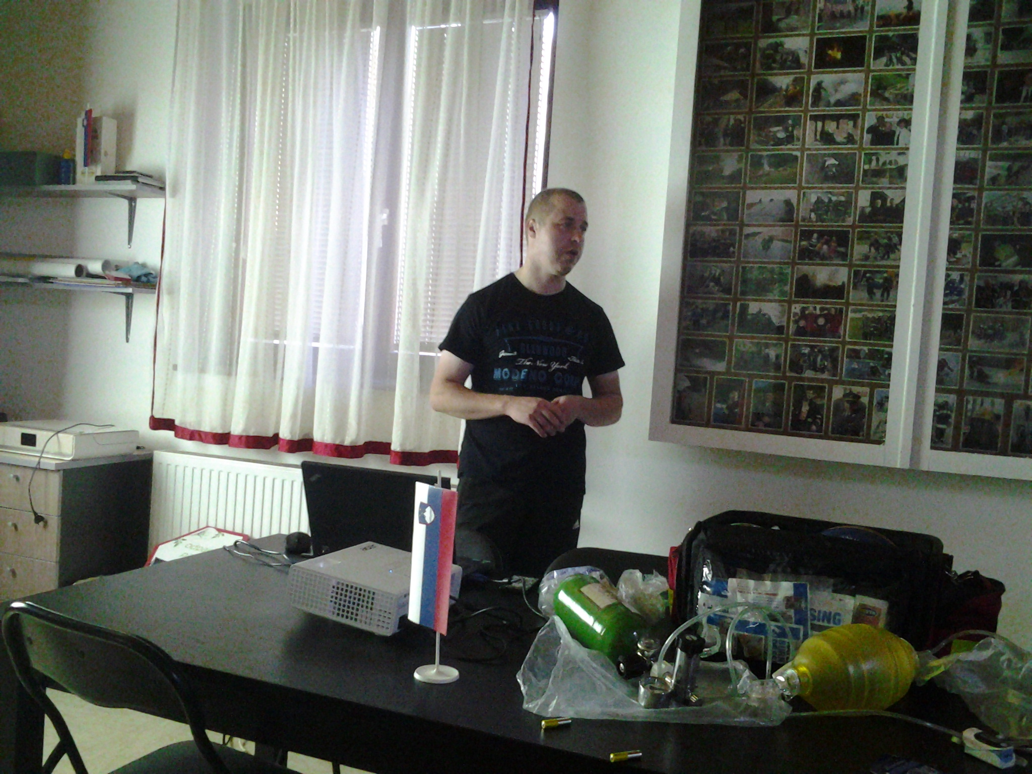 Vaje smo pričeli s pregledom vse opreme za nudenje tovrstne pomoči, katero imamo na razpolago v torbah za prvo pomoč. Pregled je bil opravljen tudi iz razloga, ker je bila določena oprema v zadnjem času nekoliko prerazporejena, na ta način so bili vsi prisotni seznanjeni z novo razporeditvijo. Sledilo je predavanje na temo aplikacije čistega kisika. Sodelujoči so se spoznali z lastnostmi, sestavljanjem in nameščanjem kompleta za aplikacijo kisika, prav tako so se seznanili tudi z merjenjem kisika in sladkorja v krvi.