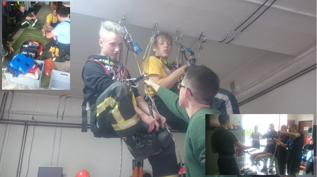 Zaradi močnejšega dežja smo namesto planiranih praktičnih vaj gašenja na višini izvedli vaje v gasilskem domu. Na vaji se je delalo na treh delovnih točkah, kjer smo obnovili znanje iz izdelave vozlov, postavljanja varovalne ograje, vzpenjanja in spuščanja po vrvi, nudenja TPO ter poznavanja opreme za prvo pomoč.