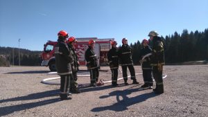 Na praktičnem delu so pripravniki pregledali garnituro za gašenje, katero imamo na razpolago v društvenem GVC-16/25. Na klasičnem napadu so s pomočjo turbo ročnika vadili oblikovanje vodnega curka in simulacijo napredovanja pri gašenju požara na odprtem prostoru.