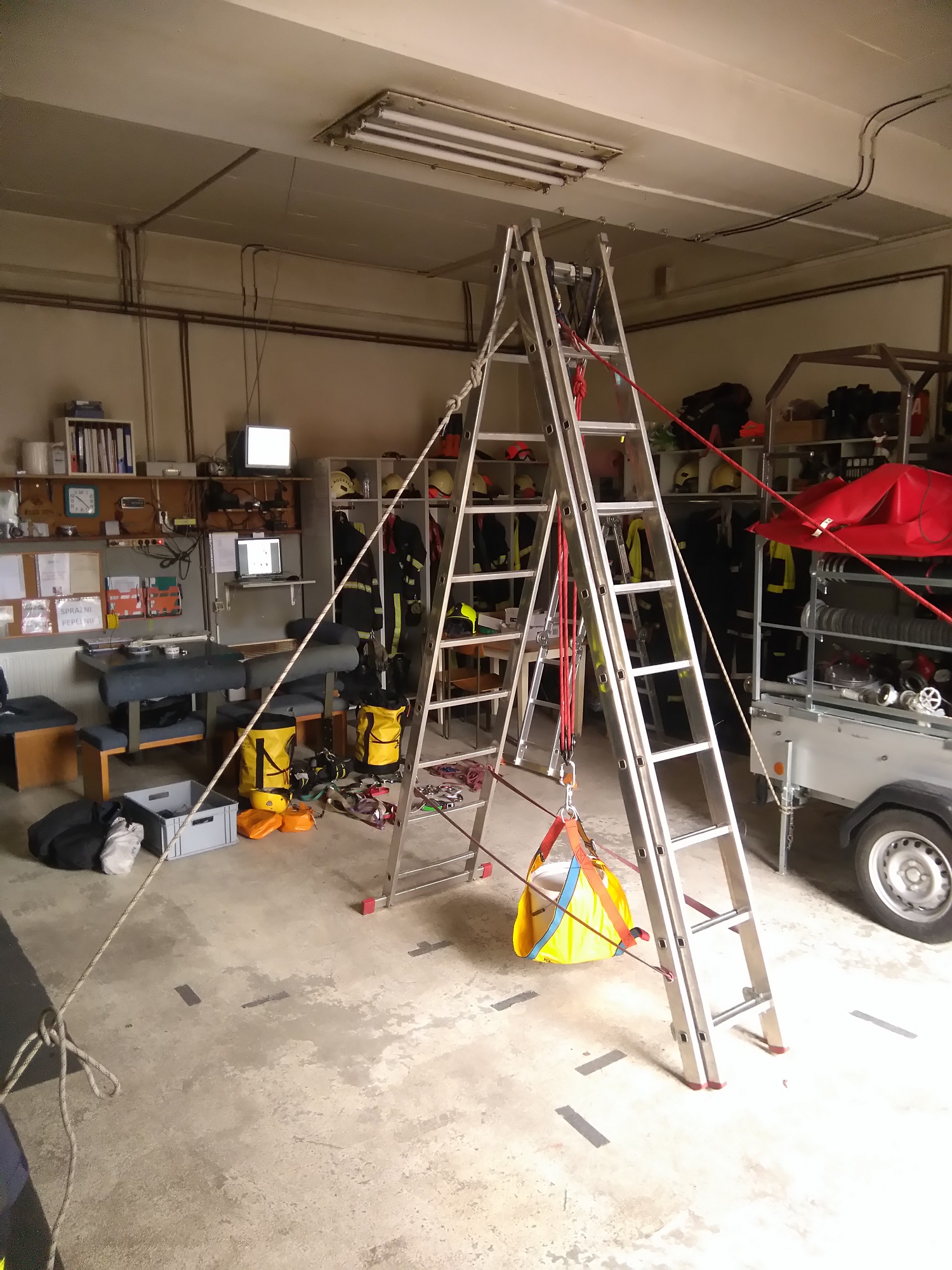 Reševanje iz jaškov, vodnjakov in drugih podobnih prostorov je bila tokratna tema vaj ekipe za vrvno tehniko. Glede na to, da v enoti nimamo namenske opreme za reševanje iz jaškov (trinožci, rollglis,…) je bil poudarek na izdelavi škripčevja na improviziranem stojalu. Tako smo s pomočjo raztegljive A lestve izdelali stojalo, ga dodatno fiksirali s pomočjo vrvi ter nanj sidrali sistem škripčevja z reševalnim sedežem. Škripčevje smo izdelali iz dvojnega in dveh enojnih škripcev, dvig in spust je bil izveden preko sidrišča z gri gri varovalom in ročne prižeme. Dodatno varovanje je bilo izvedeno z blokom iz prsne prižeme. Nekaj fotografij iz vaj si lahko pogledate tule.