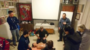 V soboto 17. februarja, smo v okviru izobraževanj za krajane izvedli prvo letošnje predavanje s praktičnim prikazom in delom na temo uporabe avtomatskega eksternega defibirlatorja (AED) z osnovami temeljnih postopkov oživljanja (TPO). Zavedamo se, da ob nenadnem zastoju srca, naglem poslabšanju stanja, hujših krvavitvah in nujnih stanjih, minute in odzivni čas še kako štejejo, zato je vsaka takojšnja pomoč bližnjih ali mimoidočih še kako pomembna, za čim prejšnjo prvo pomoč, ki jo lahko še pred prihodom nujne medinske pomoči nudijo svojci, mimoidoči ali prvi posredovalci. Trenutno naše društvo PGD Rakek razpolaga z 9 certificiranimi prvimi posredovalci, ki so ob nujnem klicu na pomoč aktivirani z regijskega centra za obveščanje (ReCO Postojna). Vendar pa, ker strmimo k temu, da se bo ta nujno potreben kratek odzivni čas za nudenje prve pomoči še dodatno skrajšal, želimo prvi posredovalci znanje in izkušnje prenesti tudi na ostale člane društva in krajane. Na včerajšnjem teoretičnem delu je poveljnik društva, Miha Modic, predstavil delovanje prvih posredovalcev, njihovo aktiviranje, naloge in zadolžitve ter sam namen prvih posredovalcev. Pomočnik poveljnika za prvo pomoč, Sergej Trebec, je v drugem delu teoretičnega dela predstavil nujne ukrepe in pravilne postopke pri nudenju prve pomoči nenadno obolelim (pravilni položaji poškodovancev, preverjanje odzivnosti in ocena stanja zavesti ter dihanja) ter pravilne postopke nudenja temeljnih postopkov oživljanja (TPO) z uporabo avtomatskega eksternega defibrilatorja (AED). Na praktičnem delu so lahko občani preizkusili in se naučili pravilnih postopkov pristopa do poškodovanca in na vadbeni lutki osvežili znanje iz masaže srca in umetnega dihanja. Ekipa prvih posredovalcev je na koncu vaje prikazala tudi njihovo posredovanje ob nenadnem zastoju srca – sodelovali so 3 prvi posredovalci in pri oživljanju uporabili AED, dihalni AMBU balon s priklopom na kisik ter izvajali temeljne postopke oživljanja do prihoda enote nujne medicinske pomoči (Trebec S.).