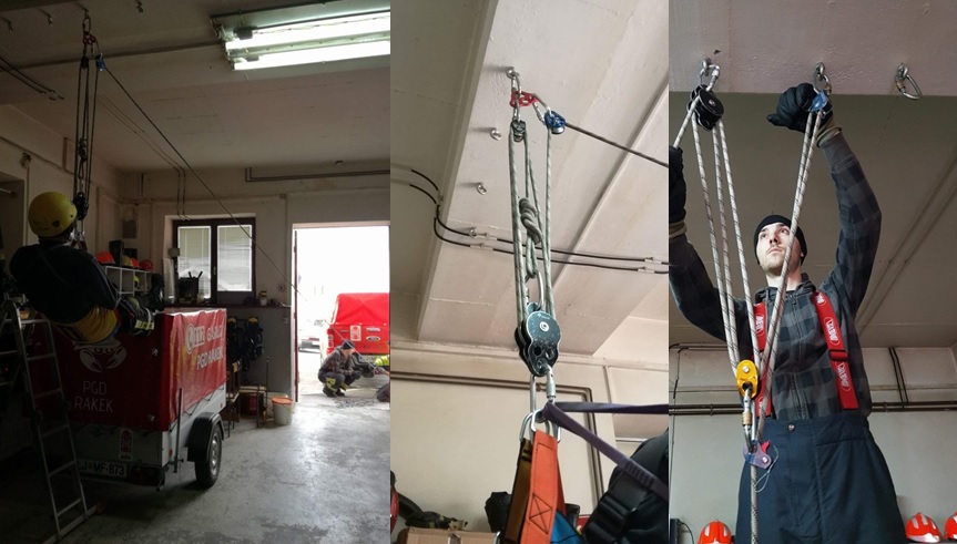 Zaradi neugodnih vremenskih razmer smo tudi tokratne vaje vrvnih tehnik preživeli v orodišču gasilskega doma. Na pred pripravljenih sidriščih na stropu gasilskega doma smo vadili izdelavo različnih sistemov škripčevja namenjenih za različne načine oziroma namene dvigovanja oziroma spuščanja.