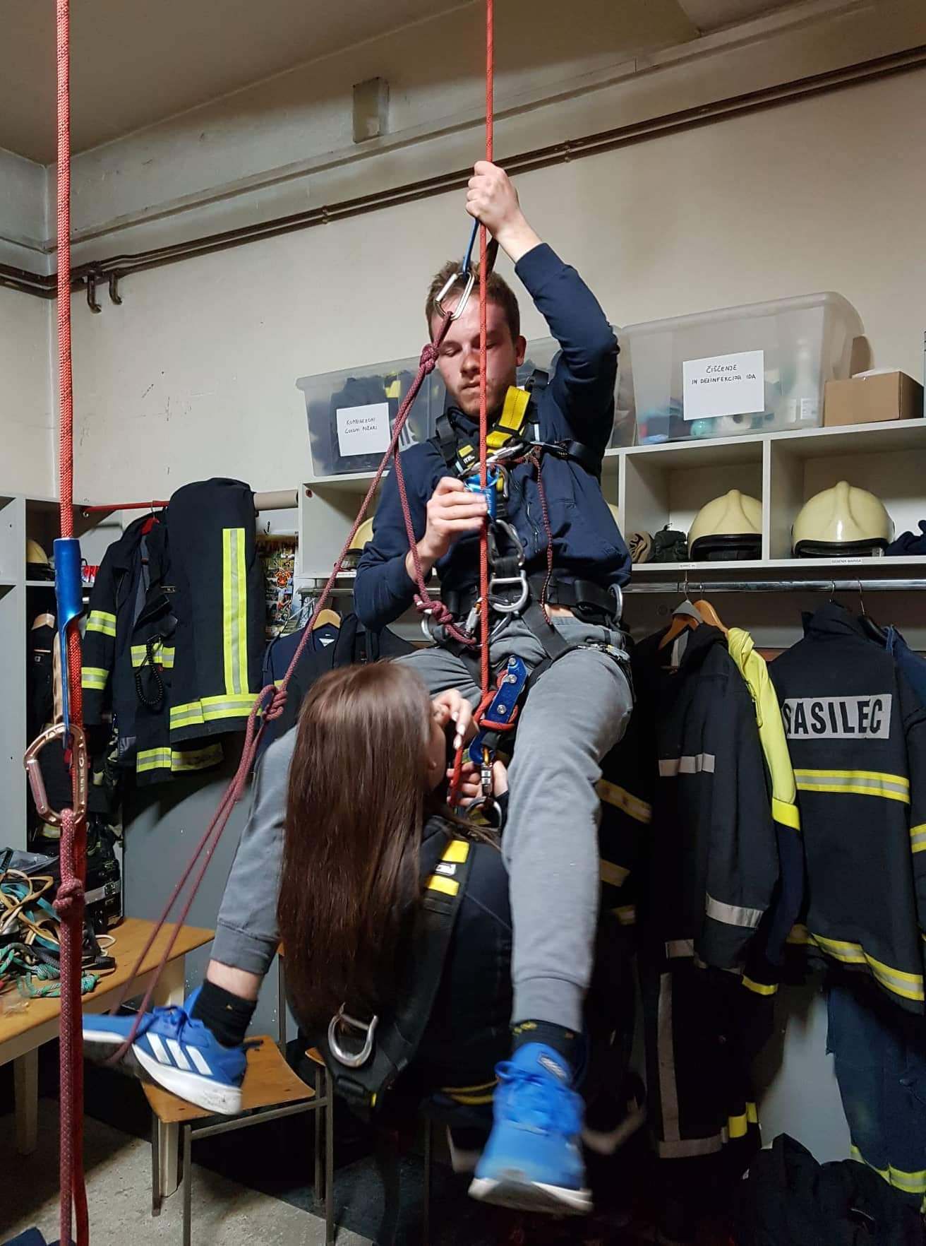 Na vajah vrvne tehnike smo se spoznavali z reševanjem tovariša na vrvi. Poznamo več situacij in načinov reševanja obstalega plezalca na vrvi. Za začetek smo trenirali reševanje sotovariša, ki je vpet v stop zavoro obstal na vrvi. Do reševanega smo se s pomočjo ročnega in prsnega žimarja spustili, se se nanj pripeli in nato oba kontrolirano spustili na tla preko stop zavore reševanega. Naslednjič nadaljujemo z ostalimi tehnikami tovariške pomoči oz. reševanja. (Trebec M.)