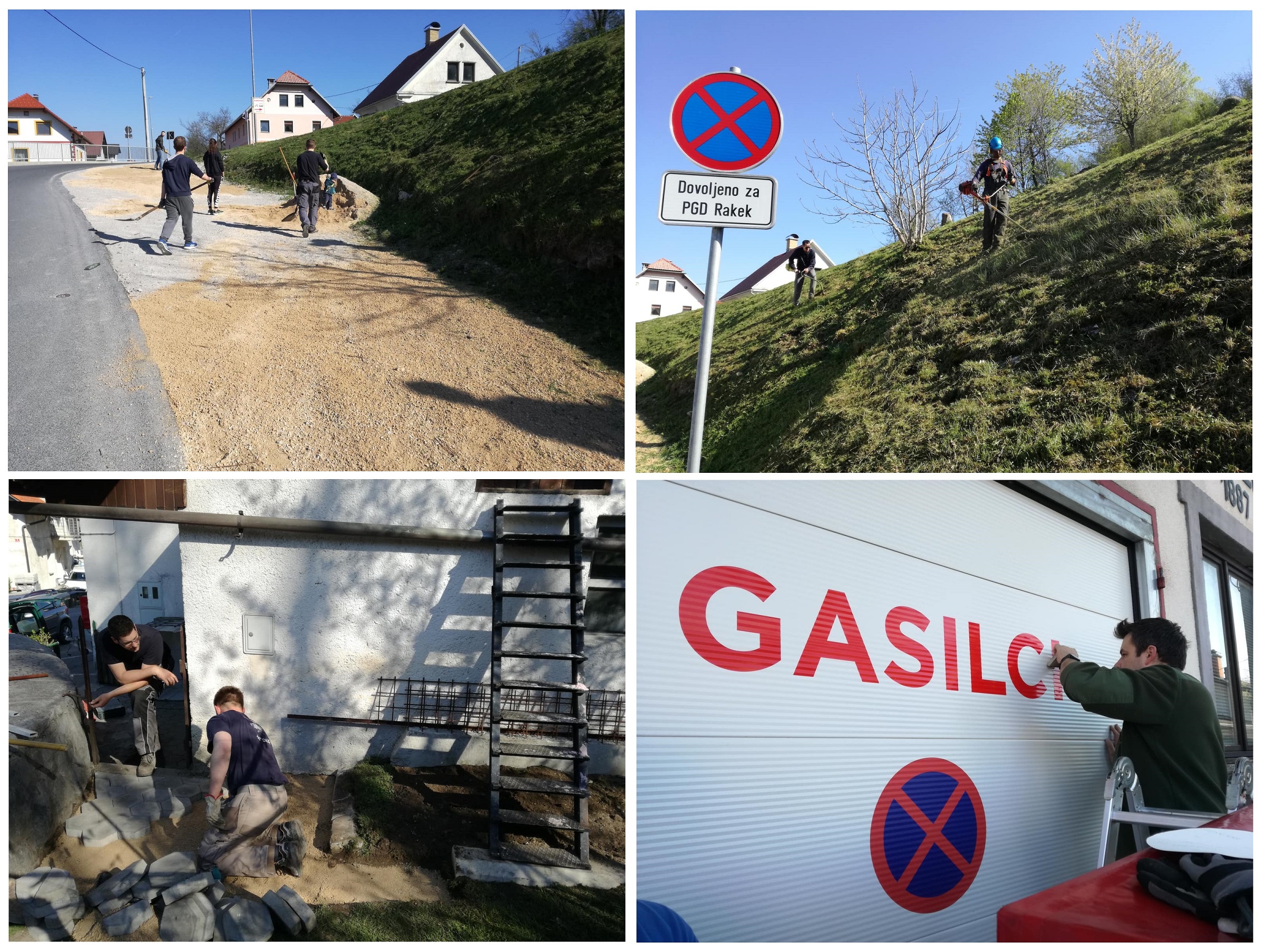 Preteklo soboto, 20. aprila, smo izvedli spomladansko delovno akcijo urejanja okolice gasilskega doma. Tako smo operativni člani uredili in utrdili makadamsko parkirišče ob cesti, pokosili in uredili travnato brežino nad gasilskim domom, dodatno pričvrstili stopnice na podstrešje in s tlakovci utrdili pot do njih. Na dvižnih garažnih vratih se je obnovilo napise in dodalo znake za prepovedano parkiranje in ustavljanje, novo barvo je dobil tudi okvir dvižnih vrat orodišča. Orodišče je po dolgih letih dobilo novo osvetlitev, tako so stare neonke zamenjala nova LED svetila. (Trebec S.)