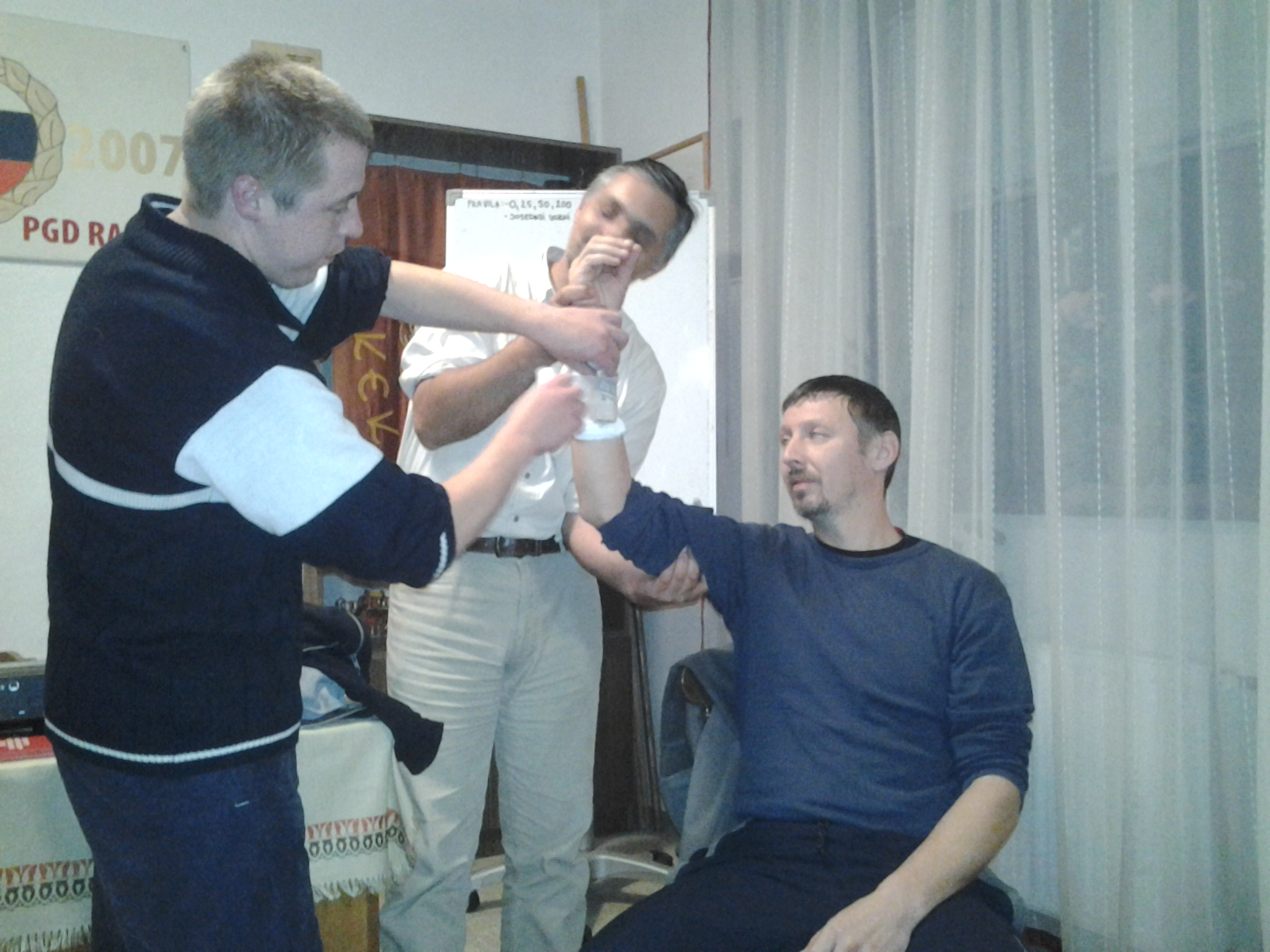 V četrtek 11.10.2012 smo v PGD Rakek pričeli z srečanji bolničarjev z namenom, da obnovimo znanje iz prve pomoči in seznanimo z novimi smernicami v prvi pomoči. Udeležba je bila nad pričakovanji, saj se je srečanja udeležilo 12 operativnih članov društva, po večini z specialnostjo bolničar. Tema na prvem srečanju so bile krvavitve in oskrba ran. V teoretičnem delu smo obnovili že pridobljeno znanje, na praktičnem pa smo menjevali vloge ponesrečenec – bolničar. Tako je lahko vsak ponovil osnove oskrbe poškodovanih udov – poudarek je bil na pravilni izdelavi kompresijske obveze. Pogledali smo si tudi izdelavo Esmarchove preveze – namestitev preveze je izrecno le ukrep v sili! Zanj se odločimo le v najresnejših okoliščinah, ko moramo izbirati med reševanjem življenja in reševanjem uda! Na naslednjem srečanju bomo vse skupaj ponovili na še več praktičnih primerih, vaje se bodo vršile po delovnih točkah.