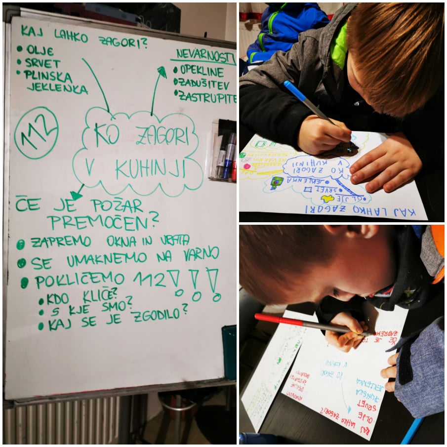 Tudi tokrat smo se z našimi najmlajšimi srečali, ter skozi ustvarjanje miselnih vzorcev naučili nekaj nujnih ukrepov ob požaru v kuhinji. (N. Milošević)
