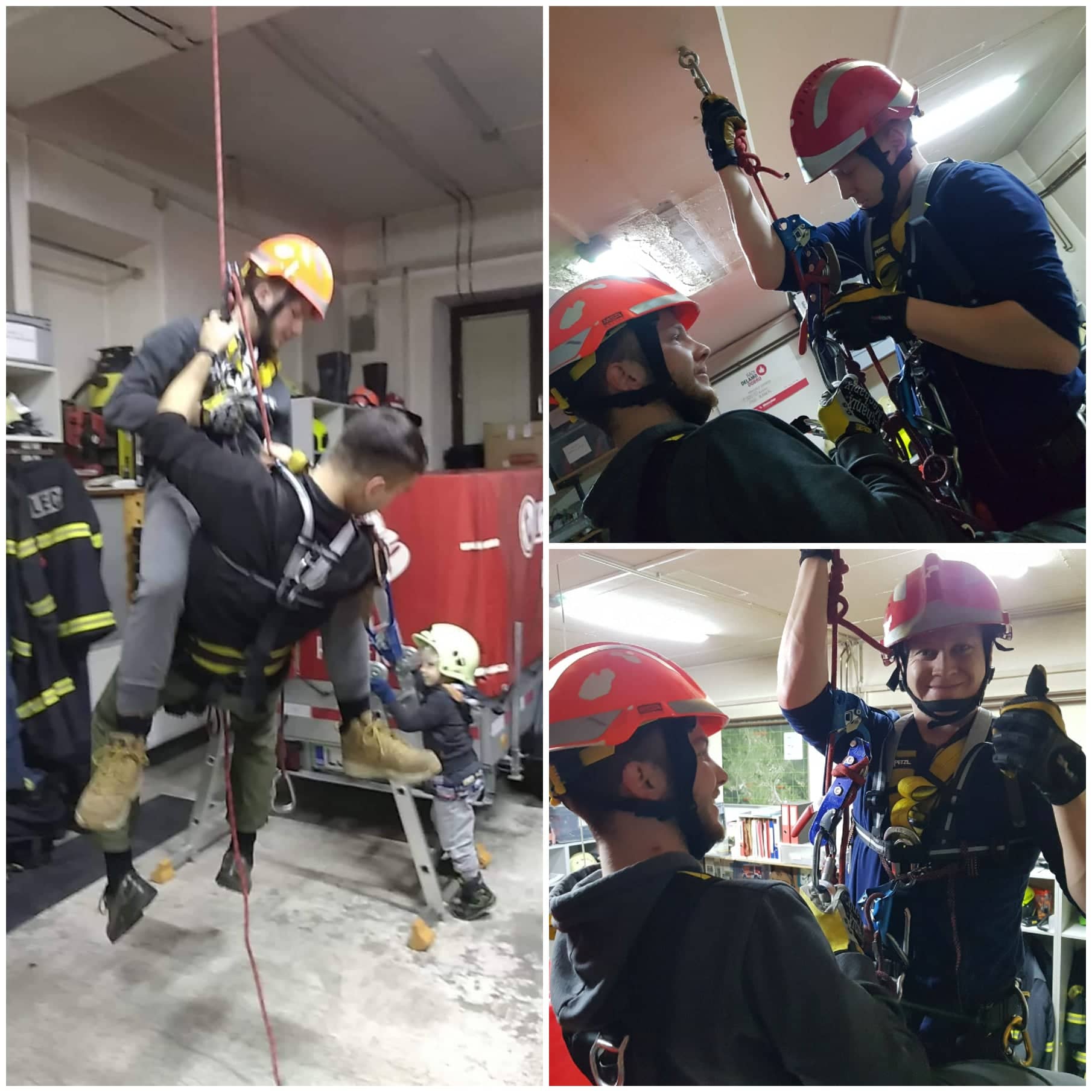 Na prvih vajah v novem letu smo vadili tovariško pomoč. Gre za reševanje soplezalca ali ponesrečenca, ki je obtičal na vrvi. S predpostavko, da je bil soplezalec na vrv vpet s sistemom za spuščanje, smo vadili tehniko pristopa po isti vrvi s spodnje strani. Manever reševanja je zahteval žimarjenje do soplezalca, vpetje na sistem za spuščanje in hkratno spuščanje reševalca in soplezalca po vrvi.