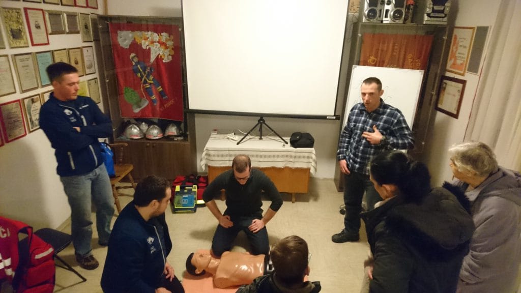 V soboto, 29. februarja, smo v okviru izobraževanj za krajane izvedli letošnje predavanje s praktičnim prikazom in delom na temo uporabe avtomatskega eksternega defibirlatorja (AED) z osnovami temeljnih postopkov oživljanja (TPO). Namen izobraževanja je prikazati občanom pravilen pristop pri nenadno oboleli osebi, ko gre za sum na zastoj srca ali zaporo dihalne poti, predvsem s poudarkom na zelo pomemebnem in hitrem odzivnem času (očividcev, svojcev,…), da pričnejo že sami s pravilnimi postopki TPO še pred prihodom prvih posredovalcev in ekipe NMP. Naše društvo trenutno šteje 11 prvih posredovalcev, ki so skupaj z ostalimi prvimi posredovalci iz Unca in Ivanjega sela (gasilski sektor Rakek) aktivirani na podlagi dežurnega zdravnika NMP ZD Cerknica. V letošnjem letu je bila ekipa prvih posredovalcev na našem območju že 2x aktivirana na posredovanje s TPO. (S. Trebec)