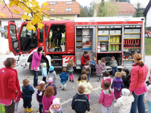 Kasneje smo odšli še v vrtec, kjer smo otrokom prestavili naše vozilo in opremo za posredovanje. Otroci so bili našega prihoda zelo veseli. Z zanimanjem so opazovali opremo, najpogumnejši pa so sedli tudi v gasilski tovornjak in se oblekli v pravega gasilca.