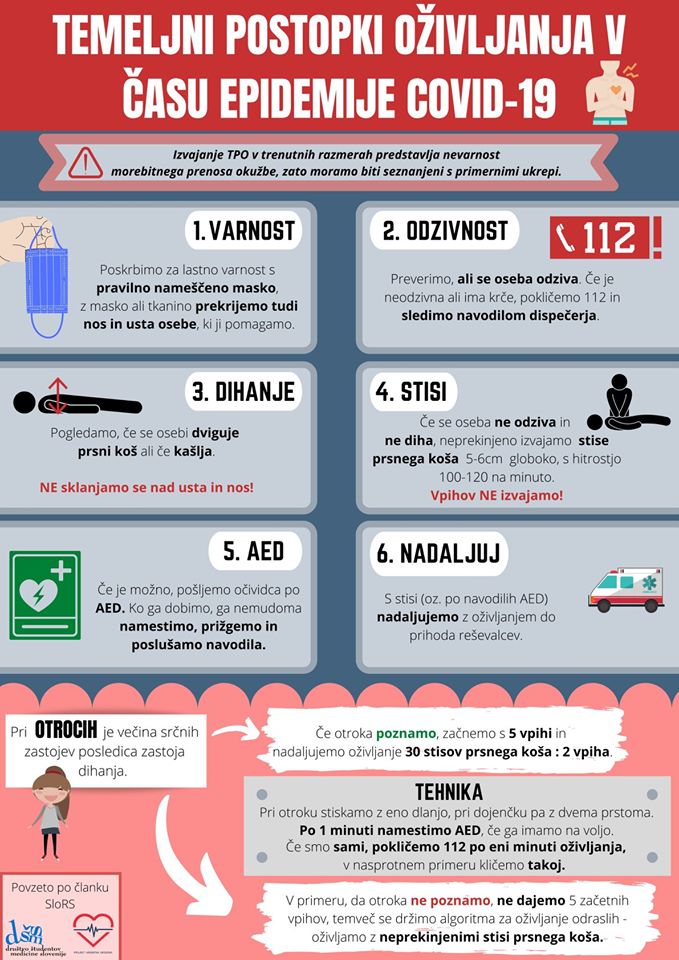 Kljub postopnemu sproščanju ukrepov v času epidemije virusa COVID-19 se moramo še vedno držati nekaterih osnovnih ukrepov, da zaščitimo sebe in druge. Ker gre pri nudenju prve pomoči za neposredne stike s pacienti, še posebej pri TEMELJNIH POSTOPKIH OŽIVLJANJA (TPO), se moramo ustrezno zaščititi in s tem preprečiti morebitbi prenos okužbe med reševalcem in obolelim.